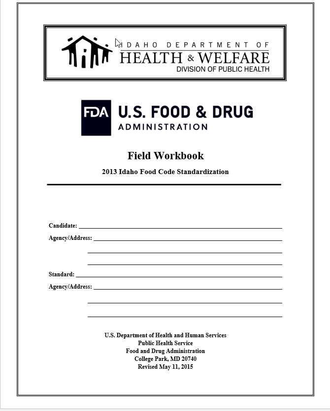 2013 Idaho Food Code Standardization Field Workbook - This workbook is to be used by Environmental Health Specialists going through the field standardization exercise. It has 8 standardization inspection reports, HACCP Plan Verification, Risk Control Plan Template, and scoring instructions.