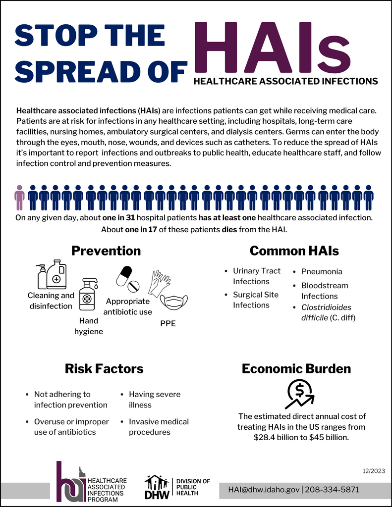 This poster provides general information about healthcare associated infections (HAIs). Place it around your facility to educate staff, patients, residents, and visitors about the risks of HAIs.