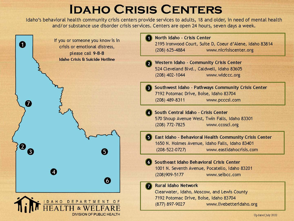 A list of Idaho's behavioral health community crisis centers that provide services for adults, 18 and older, in need of mental health and/or substance abuse disorder crisis services. Centers are open 24 hours, seven days a weeks.